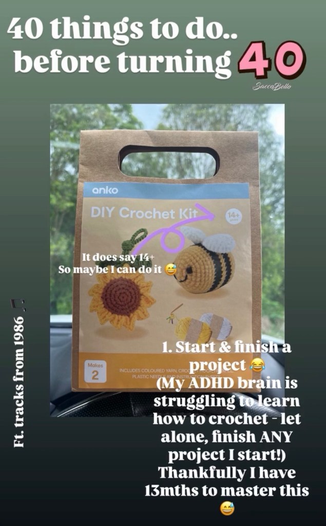 So maybe the crochet project isn’t finished. But something else has begun – I started documenting my “40 things to do” via my Instagram page, and this became my new project! To keep me motivated – I took photos, documented the process – and of course added a cool accompanying track to celebrate the music of 86′. This items track was: Lionel Richie’s “Dancing on the Ceiling”