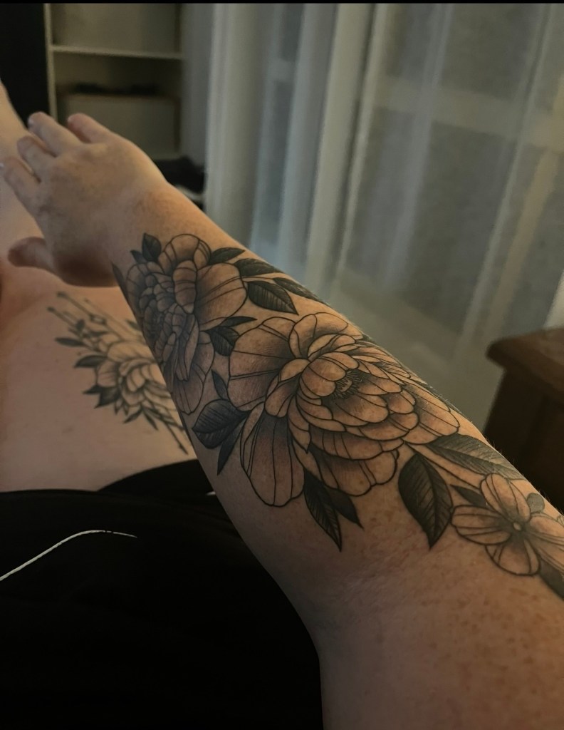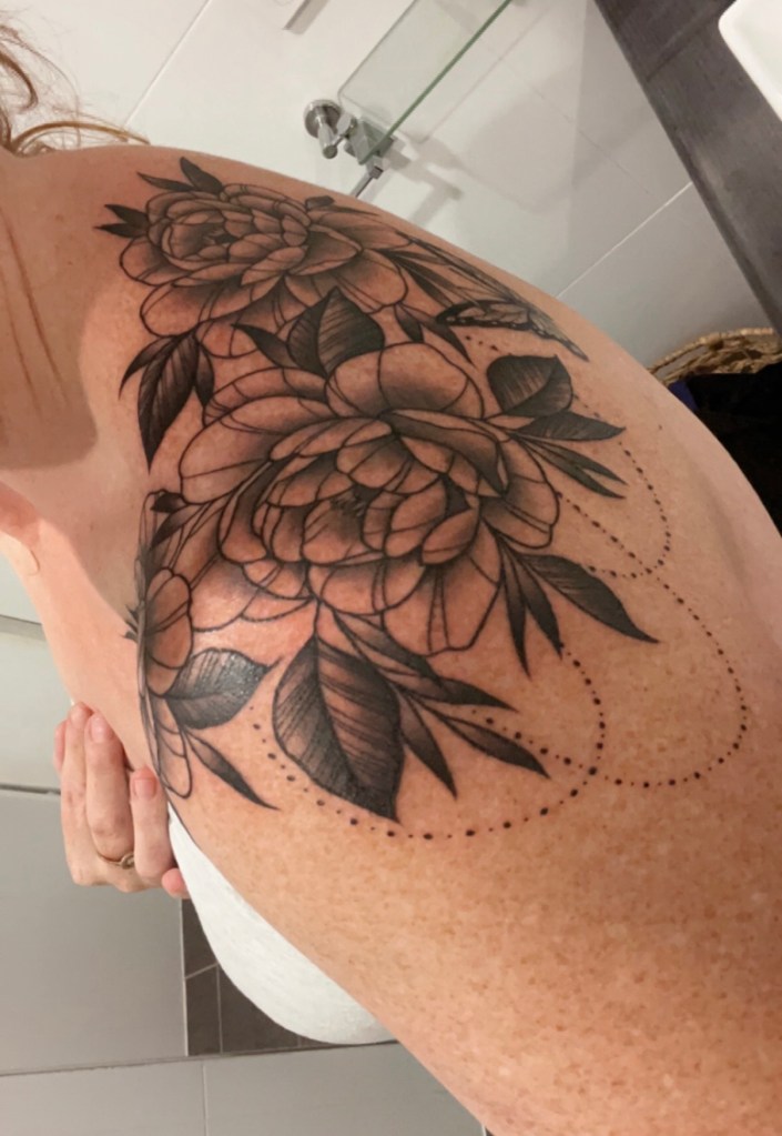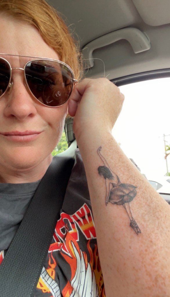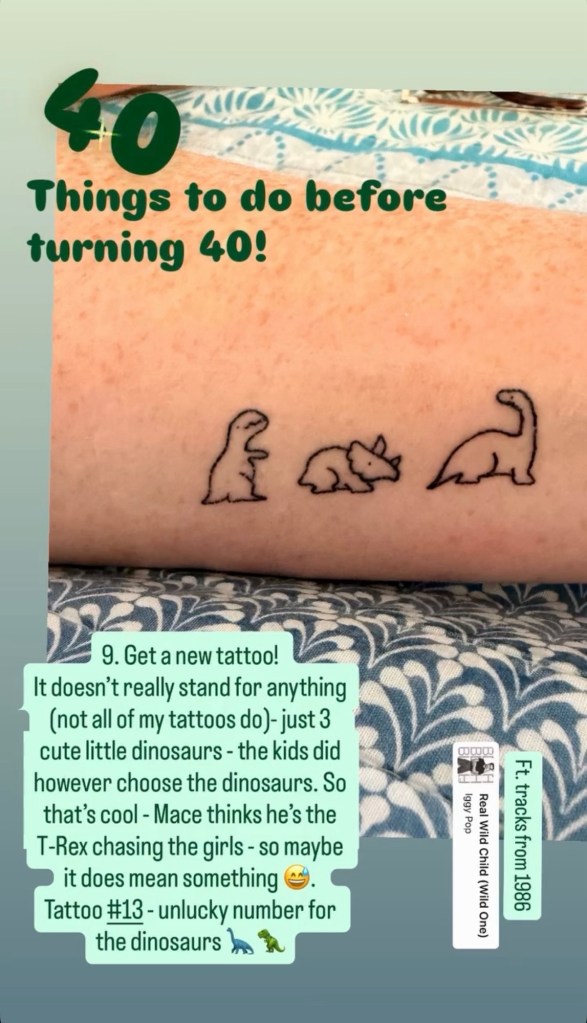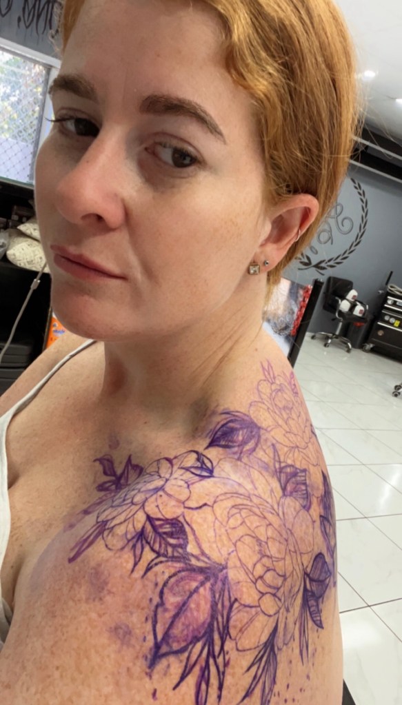 Which, for me, is a bit of a shift. Because most of my other tattoos carry meaning. I have my children’s names as monograms, pieces that represent different stages of my life, a cover-up of a tattoo I got at 17 that definitely didn’t age well, my favourite flower – (peonies for anyone who wants to buy me flowers 😂) and even a “tiny dancer,” inspired by my favourite singer.